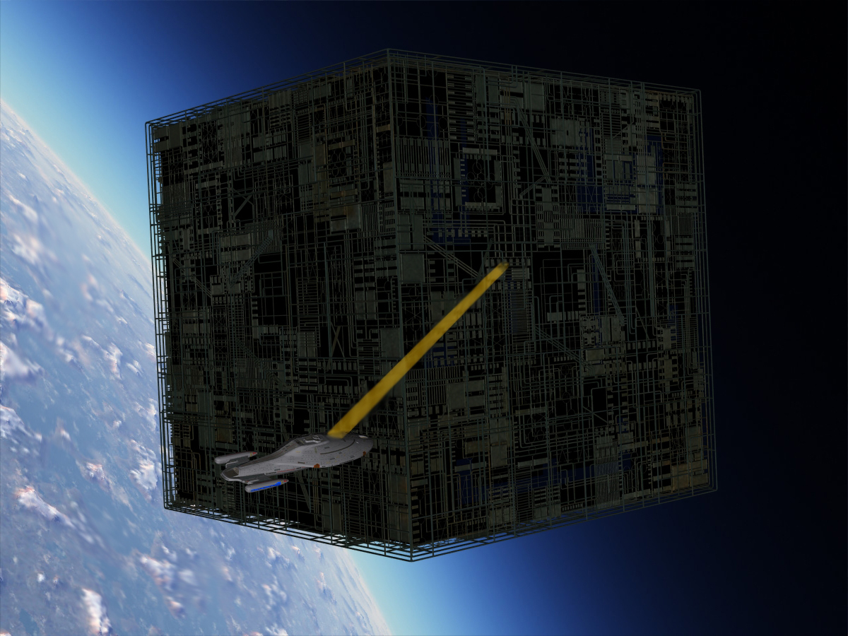 Die Beleuchtung ist noch optimierbar - den Borgwürfel seitlich beleuchten ? Wie schon von sb gesagt: Beleuchtung/Lichter an beiden Schiffen einschalten? Ein paar Sterne - Galaxien ? Der Lichtstrahl sollte sich nach hinten stärker verdünnen = verstärkt Perspektive.lg