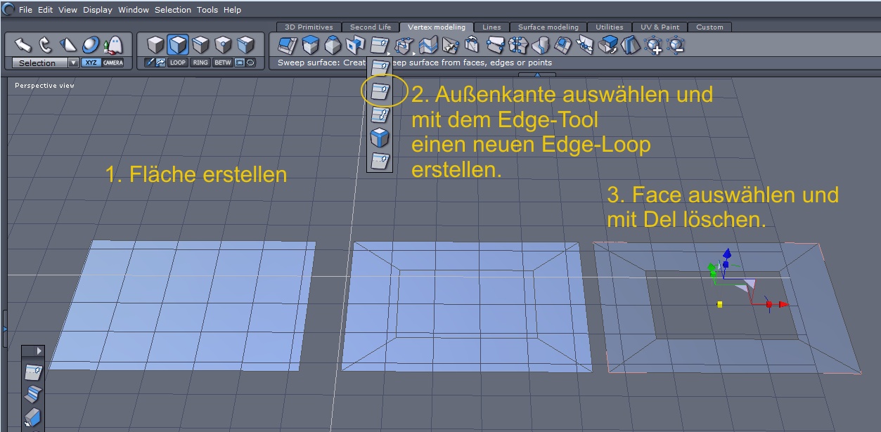 Ich arbeite mit Hexagon 2.5 und Poser 9. Ich versuche eine Öffnung in einer Eben darzustellen oder in einem Körper - z.B. Für ein Fenster in einer Wand oder ein Loch im Boden. Habe zuerst versucht das Problem einfach mit einer Ebene zu lösen, welche ein ausgestanztes Loch hat.
