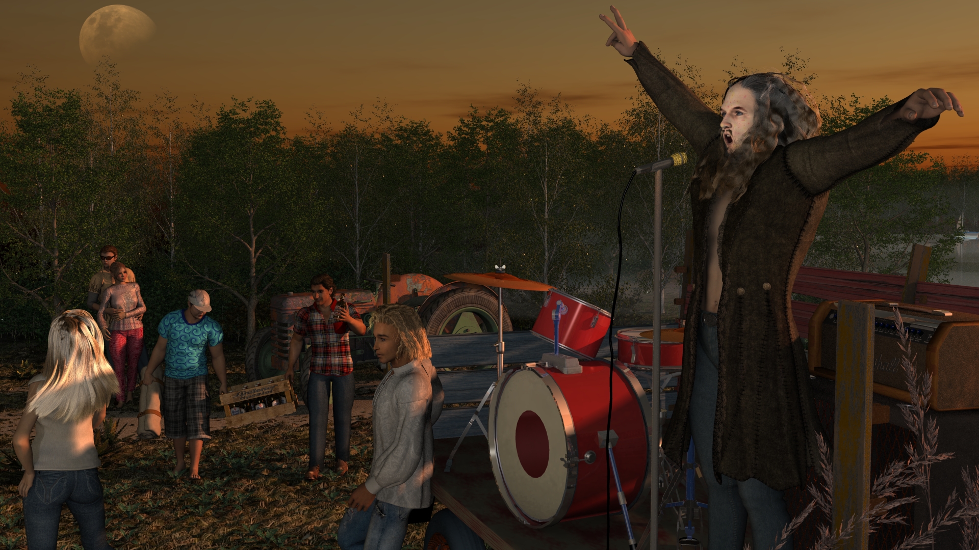 Der Traktor ist von DAZ, einige Bäume auch. Den Anhänger habe ich aus Einzelteilen zusamengebaut. Ich halte nichts von Texturen, die Bretter vorgauckeln. Oder Mauern. Besser sind dann doch einzelne Bretter und Steine, die man entsprechend zusammen fügt.