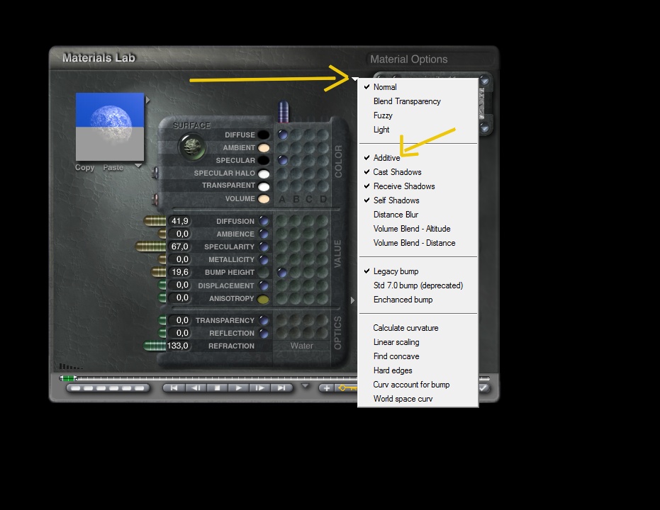 Im Benutzerhandbuch von Bryce hab ich auch was gefunden (Filter Additiv) aber ich finde das nicht im Programm. Wobei ich mir auch nicht sicher bin, ob das damit klappt.