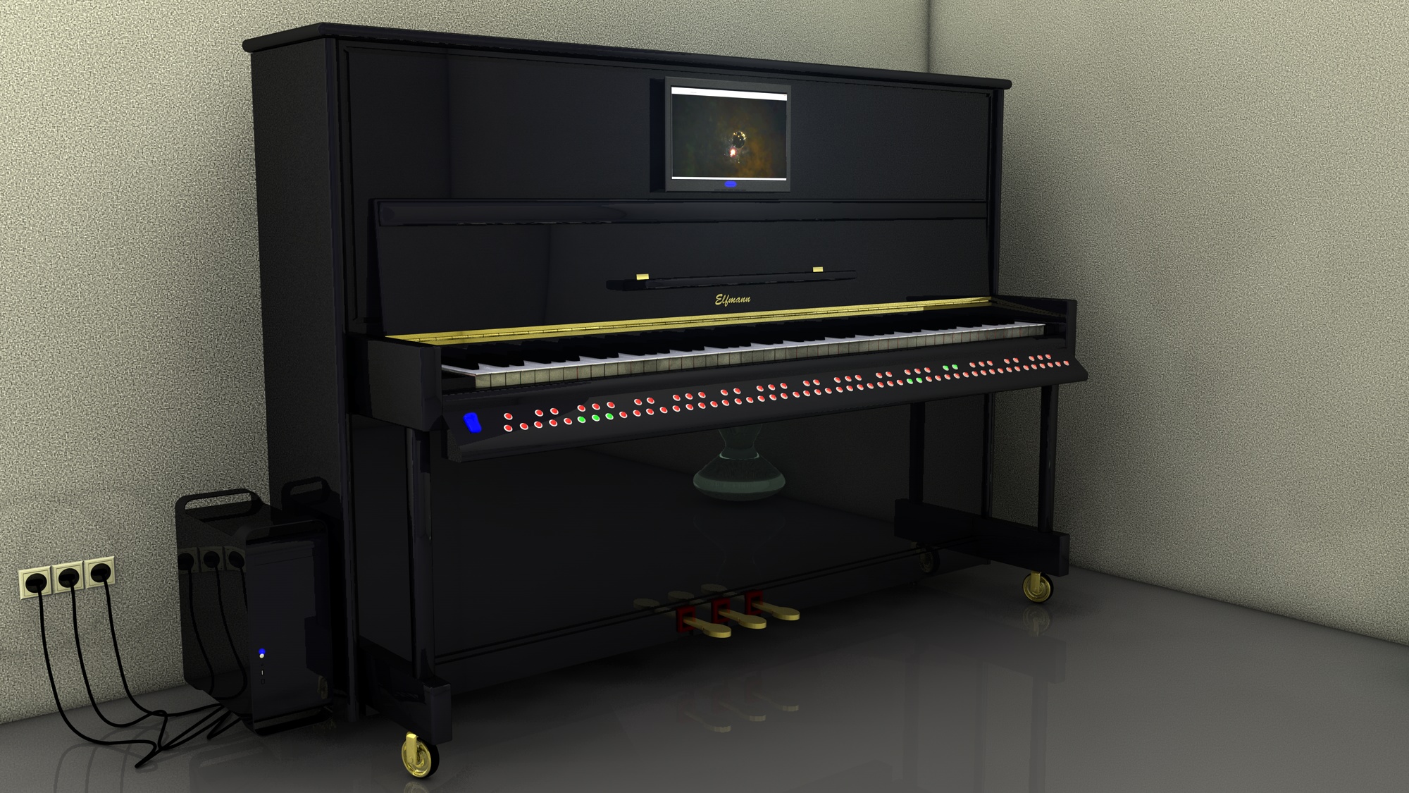 Kernstück ist ein seitlich angebrachter Mac-Rechner der mit der Steuereinheit HIDT 6001 verbunden ist. Die Steuersoftware ist Pianist 1.1.
