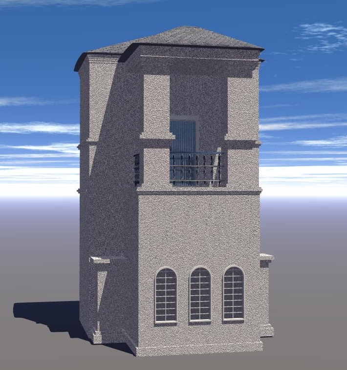 Das Strukturmuster des Putzes sollte vielleicht etwas kleiner sein. Besonders bei dem Teil mit den 3 gotischen Fenstern. Die Fensterrahmen würde ich etwas heller texturieren, evtl. cremeweiß mit ganz leichtem feinen Rauschen (Noise) im Bumpkanal.