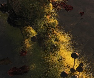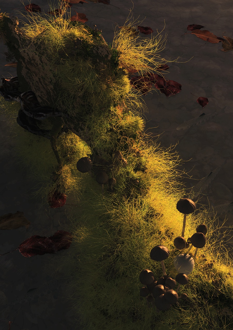 Ich mag es, wenn man ganz nah rangeht*. Bis ins letzte Detail! Grasspitzen, Erde, Pilze, abgestorbene Blätter im Hintergrund und ein interessantes Licht!