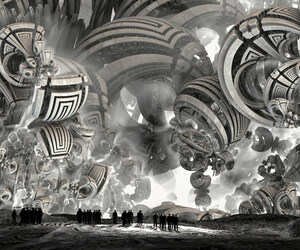 @Rüdiger: Der monochrome Bilddton entspricht den Farben des Hintergrundfraktals, das ich auch für die Bodentextur verwendet habe. Mehr Farben gabs nicht im Bild, auch nicht bei den grauen Herren.