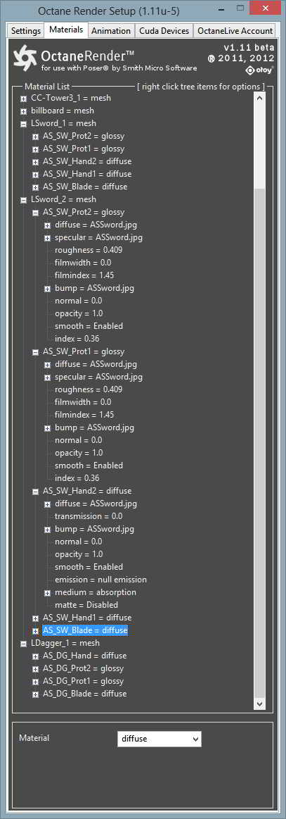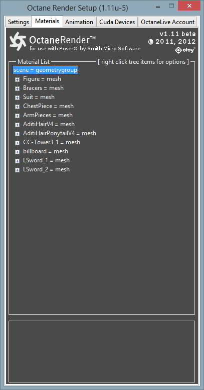 Das Plugin überträgt die Objekte und konvertiert die Poser- zu Octane Materialien. Dies funktioniert im allgemeinen recht gut, scheitert jedoch des öfteren bei zu komplex aufgebauten Poser Shadern. Hier gilt, je einfacher das Posermaterial umso besser gelingt die Umsetzung. Das hat nichts mit den Shadern an sich zu tun, Octane benutzt einfach ein anderes System als der Firefly Renderer, das eben mehr oder weniger gut zu übersetzen ist. (Bild 2)