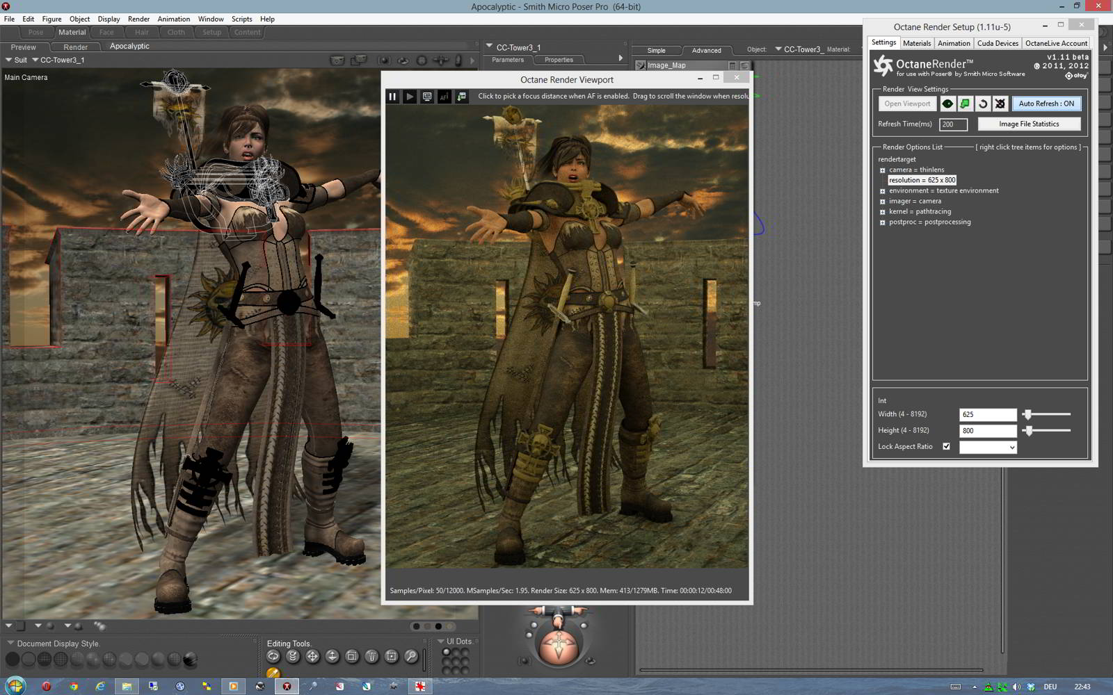 • Ich habe mir mal das Demo-Plug-In für Poser runtergezogen und einfach mal Nackedeis mit einer Hintergrund-Plane gerendert. Das hat sehr gut funktioniert. Nur bei einer größeren Szene mit Klamotten und einem Raum von DM wurde der Button für den Material-Manager (heißt das so?) gleich rot. Soweit ich das noch im Gedächtnis habe, zählte Octane 40 RGB Textures und 32 Graustufen Textures, was dann zuviel war.