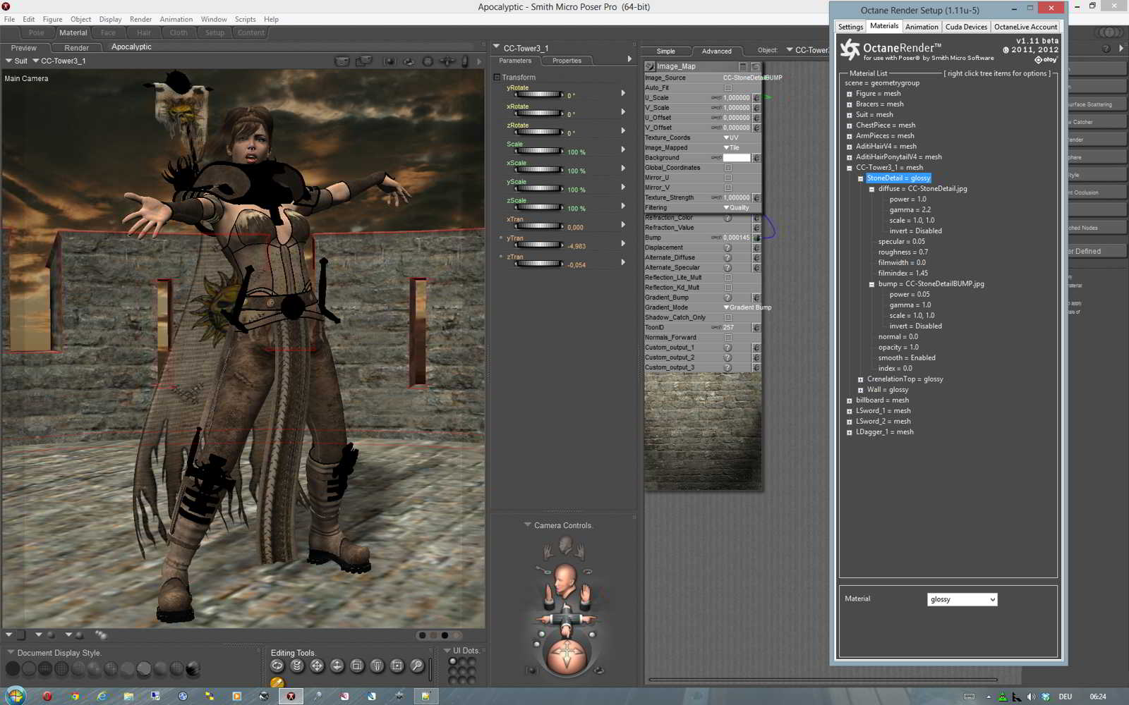 Ich fange mal mit den Steinen an und setze diese auf diffus mit etwas meht Bump. Bei mehreren, gleichartigen Materialzonen lassen sich diese übrigends per Copy/Paste übertragen oder auf die gesamte Figur anwenden oder auch auf alle gleichnamigen Materialzonen kopieren - eine sehr schöne Arbeitserleichterung (Bild 6). Ich gehe jetzt hier nicht weiter auf die einzelnen Untereinstellungen wie diffude, specular, opacity etc ein, diese sind im Octane Manual sehr schön beschrieben.