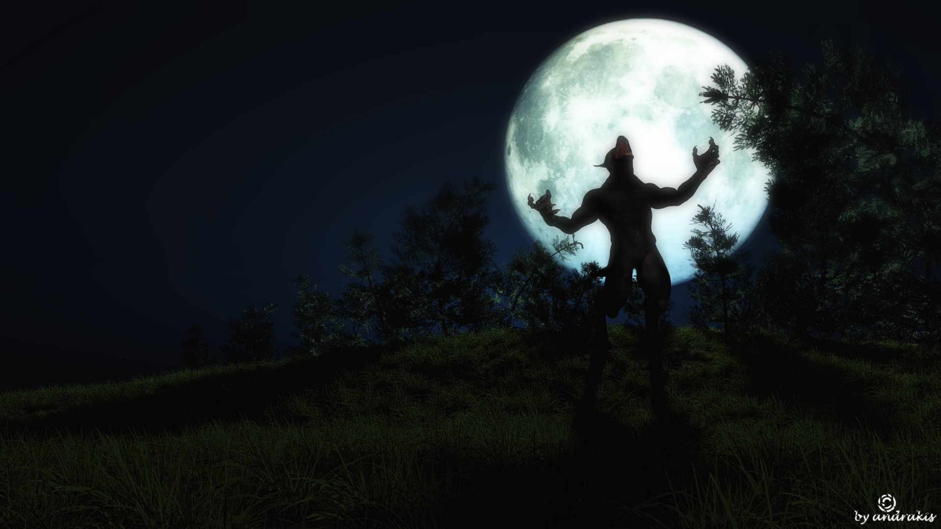 Was hier noch fehlt, um das Bild zum Leben zu bringen ist silbernes Streiflicht. Probier mal (unsichtbare) weiß-blaue Lichter unter dem Mond von hinten nach rechts und links (relativ tief) so zu setzen, dass sie nur den Rand des Grasbodens, der Figur und der Bäume erhellen.