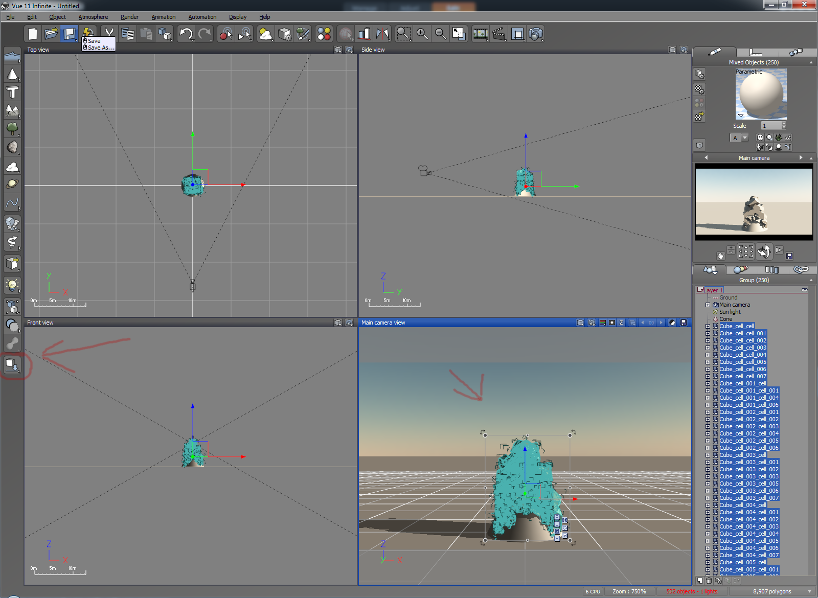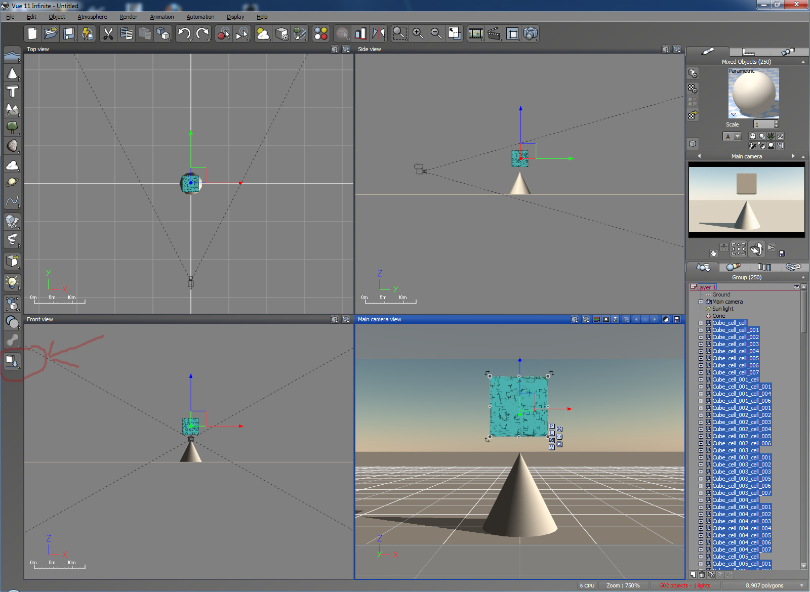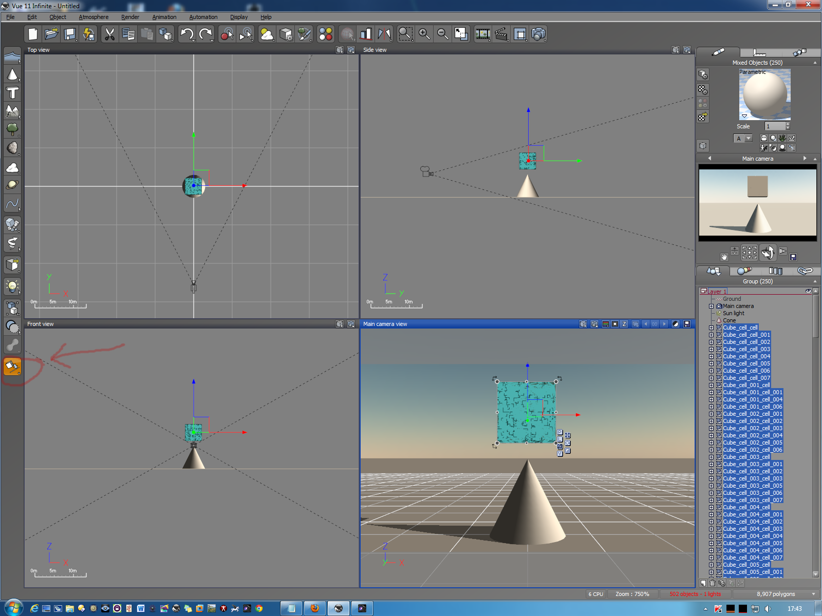 Denselben kann man dann z.B. über einen Kegel ziehen und ihn mittels Smart drop (siehe Kreis in den Bildern) auf die Spitze des Kegels fallen lassen. Vue brechnet mit dieser Funktion dann, wie die einzelenen Teile des Würfels auf der Wand des Kegels herunterrutschen würden.