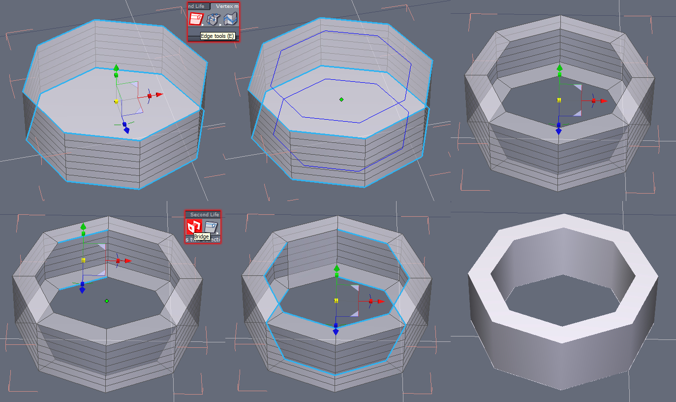 Einen "Ring" zu modeln ist nicht so schwer: du machst einen geschlossenen Zylinder, wählst dann die obere und untere Kante, drückst auf E bzw. extract edges, und ziehst eine weitere Edge nach innen in den Kreis. So hast du den "Deckel" und "Boden" des Zylinders in zwei Reihen gespalten, von denen eine aus einem N-Gon (innen) und eine aus Quadgons (außen) besteht. Das N-Gon innen löschst du. Dann wählst du eine der so entstandenen Innenkanten des Deckels und die ihr genau gegenüber liegende Kante des Bodens und verbindest sie vermittels des Bridge-Tools. Danach wählst du die anderen Innenkanten alle aus und benutzt wieder das Bridge-Tool.