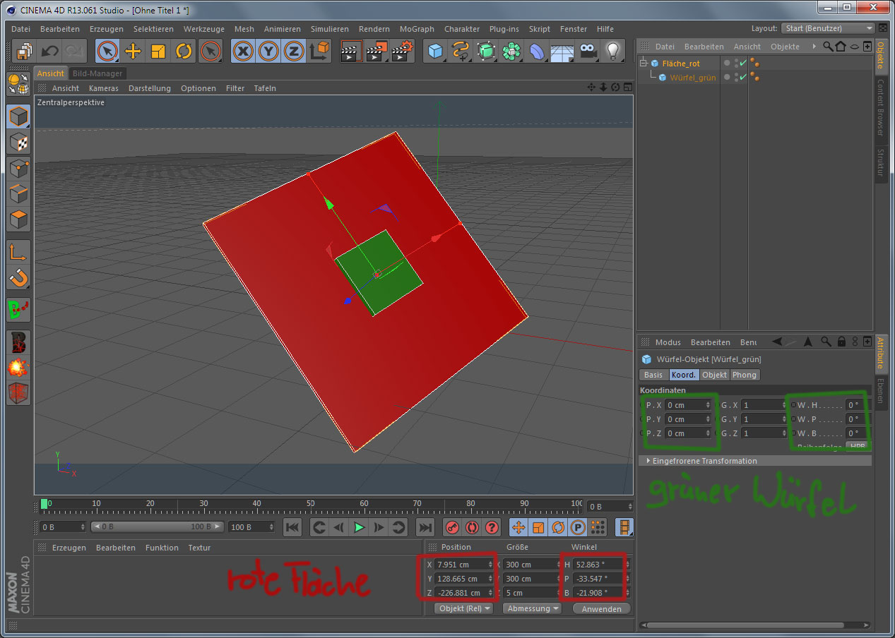 Du ordnest das Fenster im 'Objektmanager' der Fläche unter. Dann setzt Du die Position und die Winkel des Fensters komplett auf '0' dadurch übernimmt das Fenster genau die Position und Ausrichtung des übergeordneten Objekts (der Fläche).