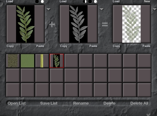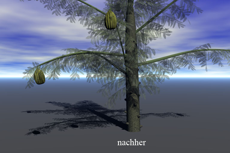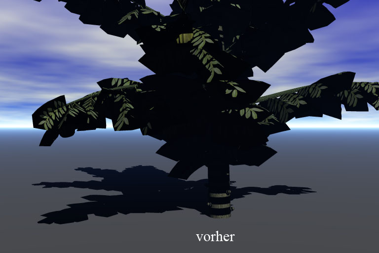 Ich habe nun - ausgehend von den OBJ-Dateien - die Tipps nachvollzogen und kam damit schon einmal zu einem recht brauchbaren Aussehen (die Bilder findet ihr im Attachment). Allerdings sind mir die Blätter noch zu schwach und fadenscheinig und das dürfte damit zusammenhängen, dass ich dieselbe Bitmap-Datei einmal für die Textur und einmal für die Alpha-Map verwendet habe. Ich hatte in Photoshop die von XFrog mitgelieferte Blatttextur auf einen schwarzen Hintergrund übertragen, so dass im Alpha-Kanal das Schwarze dann transparent werden sollte. Nur scheinen sich dabei auch anteilig Transparenzen in die Blätter eingeschlichen zu haben.