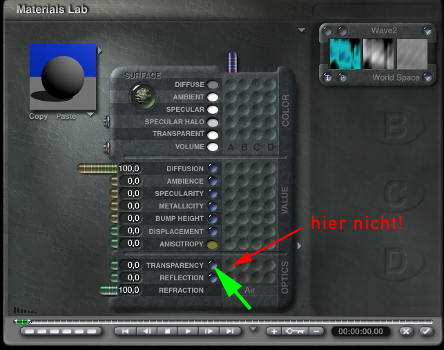 Im Anhang ist ein Ausschnitt aus dem Materiallabor von Bryce zu sehen. Links ist die Bildtextur, in der Mitte müsste der Alpha-Kanal eingefügt werden, rechts ist das Ergebnis mit den Transparenzen: