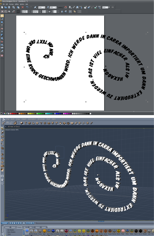 Da kannst du gemütlich in deinem Vectorprgramm arbeitenIn Carrara hat es dann einen fazinierenden Slpine Modeller , da einfach die Spline Curve impportieren extrude Bevel usw anpassen und fertig .