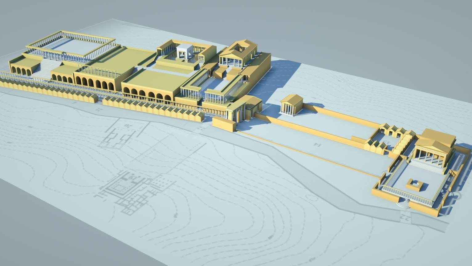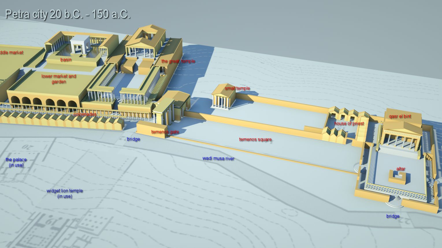 Nur größere Flächen, die Umgebung (Berge etc), es kommen noch weitere Gebäude , Pflanzen und kleinkram - das wäre zeitlich nicht zu schaffen und ist im Beispiel auch nicht notwendig, weil es nur zur Anschauung dient, wie das Stadtzentrum von P. mal ausgesehen hat.