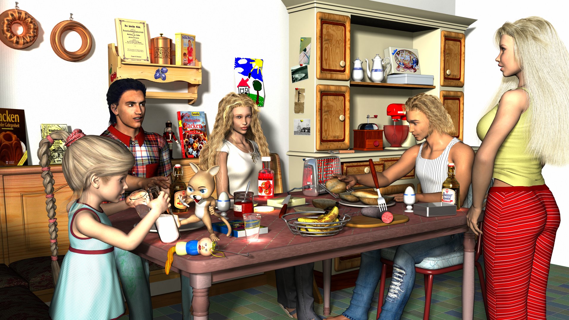 Bei dem Püpp rechts solltest Du die Armhaltung verändern. Das fällt zu sehr auf. dann mit dem Licht noch ein bisserl runter. Nicht jeder hat einen 300 Watt Strahler in der Küche. Aber Bier zum Frühstück ist mal was ganz neues ..... ^^