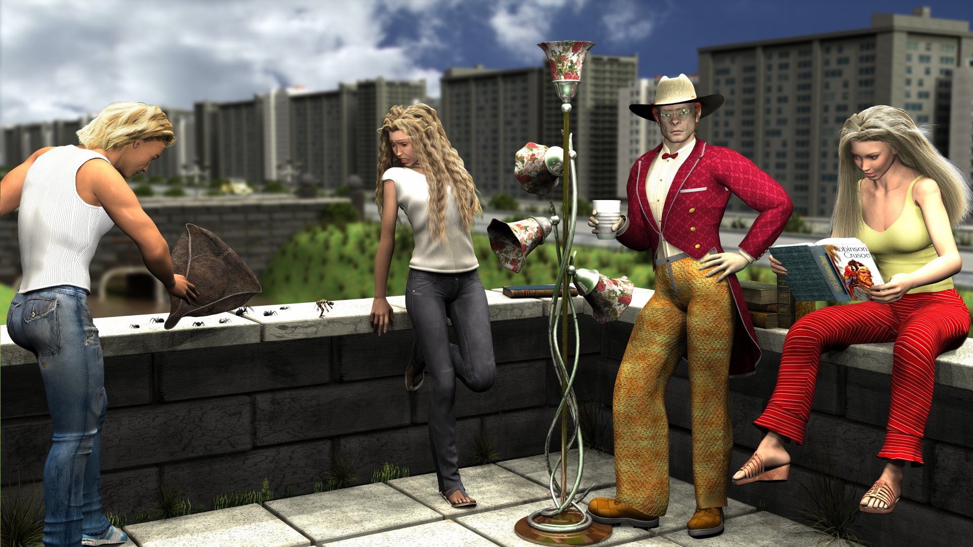 Das Pfriemeln des Stoffes an der Stehlampe hat wie immer viel Geduld erfordert, ich habe das Prozedere dann vereinfacht, indem ich einen Lampenspot fertig gemacht habe und dieser wurde einfach dreimal geklont. Die Lampe ist aus einem dieser üblichen DAZ-1.00USD-Sets.