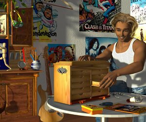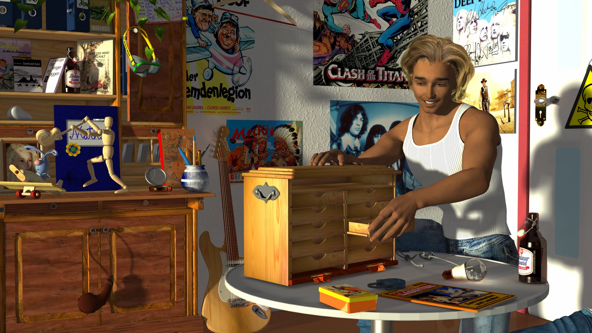 Das Zimmer von Klaus ist inzwischen bekannt. Ich brauchte nur den Zettelkasten neu basteln, das ging schnell von der Hand, auch die Scharniere. Der Knoten ist wahrscheinlich von DAZ, irgendein Mitnahmeartikel, Kostüm des Zauberers oder so ähnlich. Taucherbrille auch DAZ.