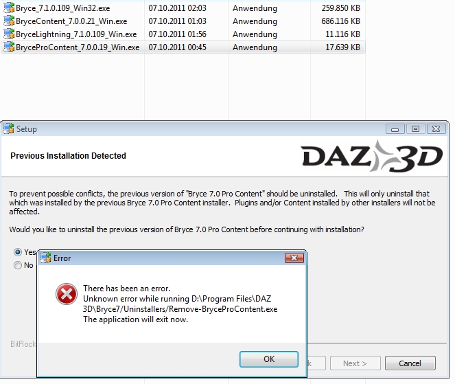 Es gibt eine Datei Bryce-Content und eine Datei Bryce-Pro-Content. (Die Fehlermeldung auf dem Bild ignorieren. Die hat sich erledigt).