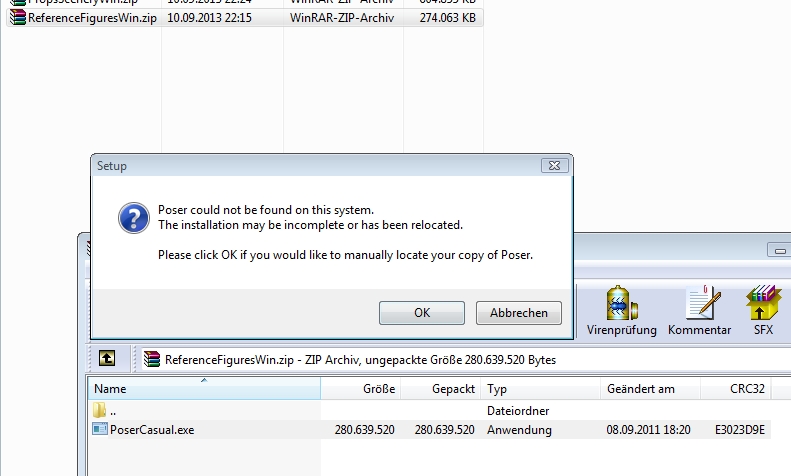 man muss erst ALLE Dateien auspacken. Auch die Poser - Installroutine und darf sie nicht vom WinZip aus starten.