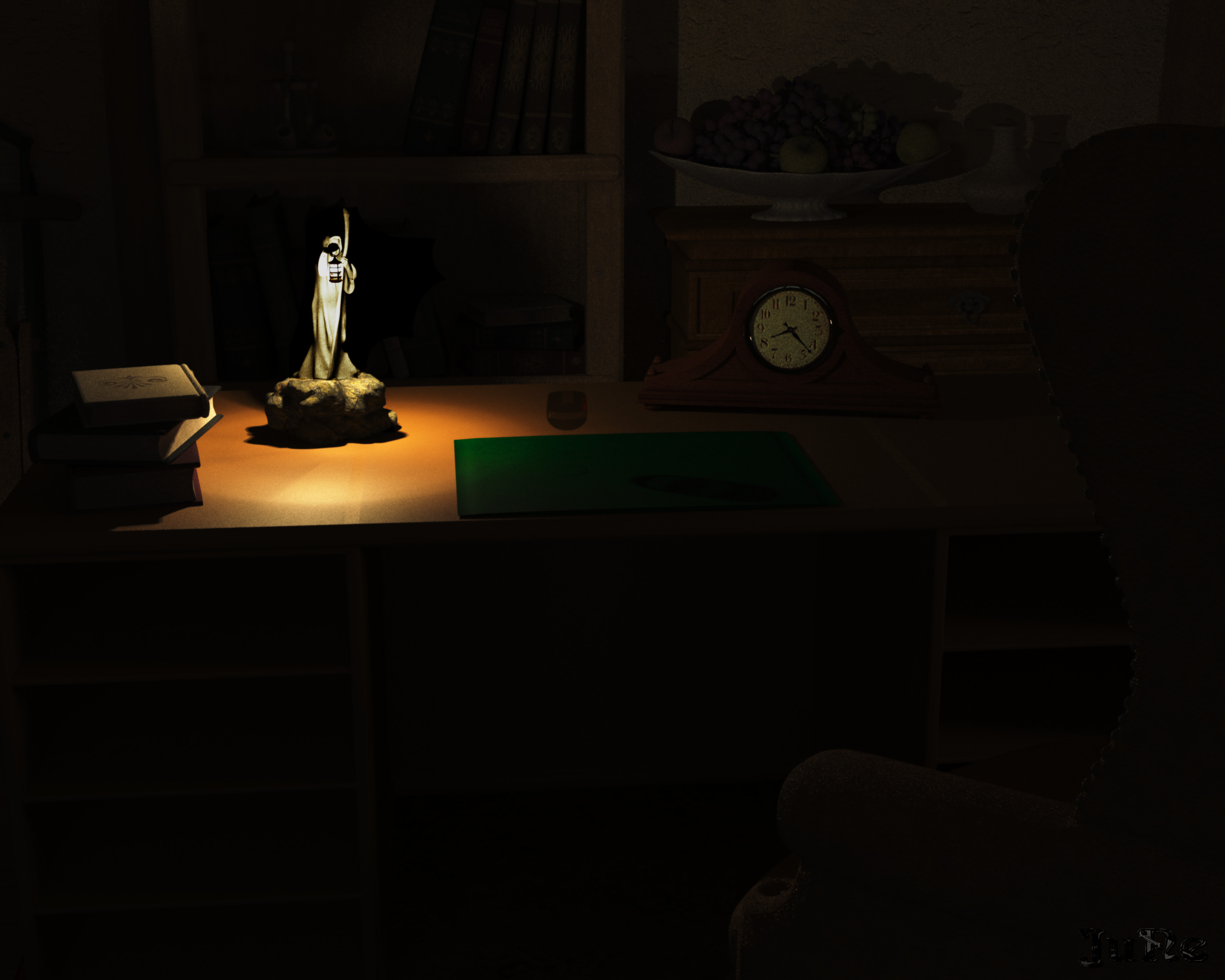 Da ich mit Luxus gerendert habe (daher auch die etwas pixlige Qualität... ich habe zwar 24 Stunden rendern lassen, aber ich glaube, ich hab was groß gerendert... :whistling: ) ist der Render unten sicher nicht abgebrochen. Eigentlich sollten das Feuer und das Fensterlicht (beides Meshlights auf einer im Zimmer bereits vorhandenen Plane) dafür sorgen, dass es da nicht so dunkel bleibt, aber ich hab sie wohl doch was gering eingestellt. Unten im Bild sind eigentlich nur Stuhl und Schreibtisch (ohne Schubladen).