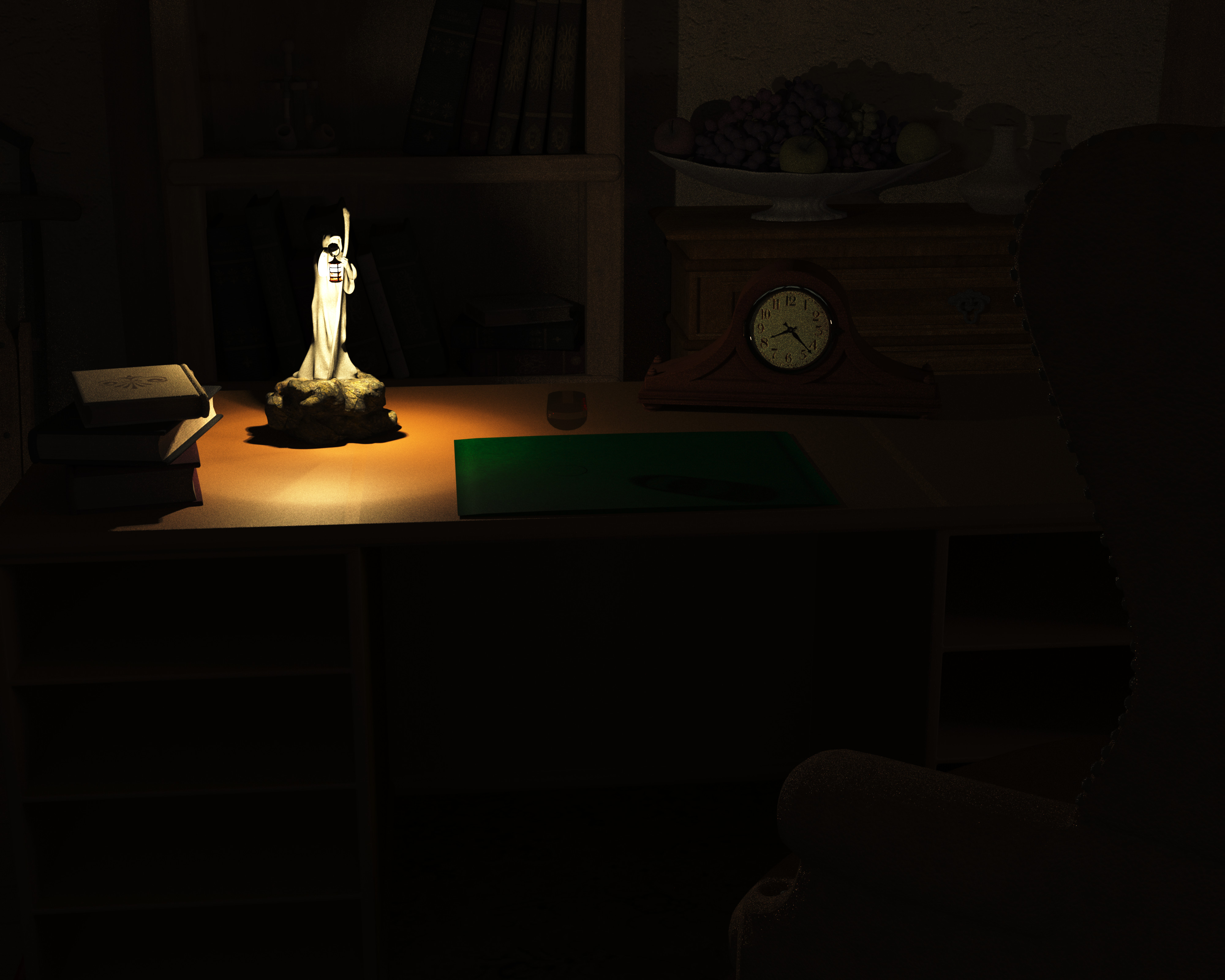 Es war leider so, dass die Statue völlig überbeleuchtet wurde, und daher ein Krampf, das in Gimp wieder halbwegs gerade zu biegen. Als Vergleich auch noch mal der Originalrender: