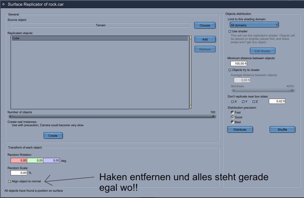 In CARRARA, bei Verwendung des Surface Replicators, folgen alle Objekte der Oberfläche. Was manchmal, gerade am Hang, sehr peinlich aussehen kann.