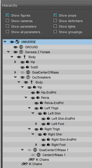 • Also, in der Hierarchy unter der Figur Sneakers ist ein Right Thigh und ein Left Thigh vorhanden, und die Sneakers hängen auch korrekt unter der Genesis2, wenn ich das richtig lese.