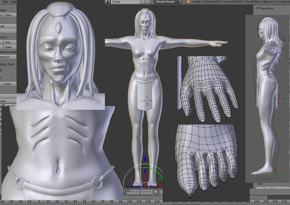 Eine kleine Premiere gibt es auch. Hier habe ich das erste Mal einen Charakter von MakeHuman benutzt. Als Obj in Blender importiert und dann doch ziemlich modifiziert. Das Char-Mesh kam in vielen Einzelteilen in Blender an. Also erstmal alle Teile mit STRG+J zu einem Mesh vereint (Remove Doubles schadet hier auch nicht). Das ergibt dann schon einen schönes sauberes Mesh, mit sauberen Edgeloops.