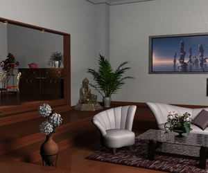 Die Wohnzimmermöbel sind Poser-Importe, das Bad ist komplett mit allem in Bryce gewerkelt.