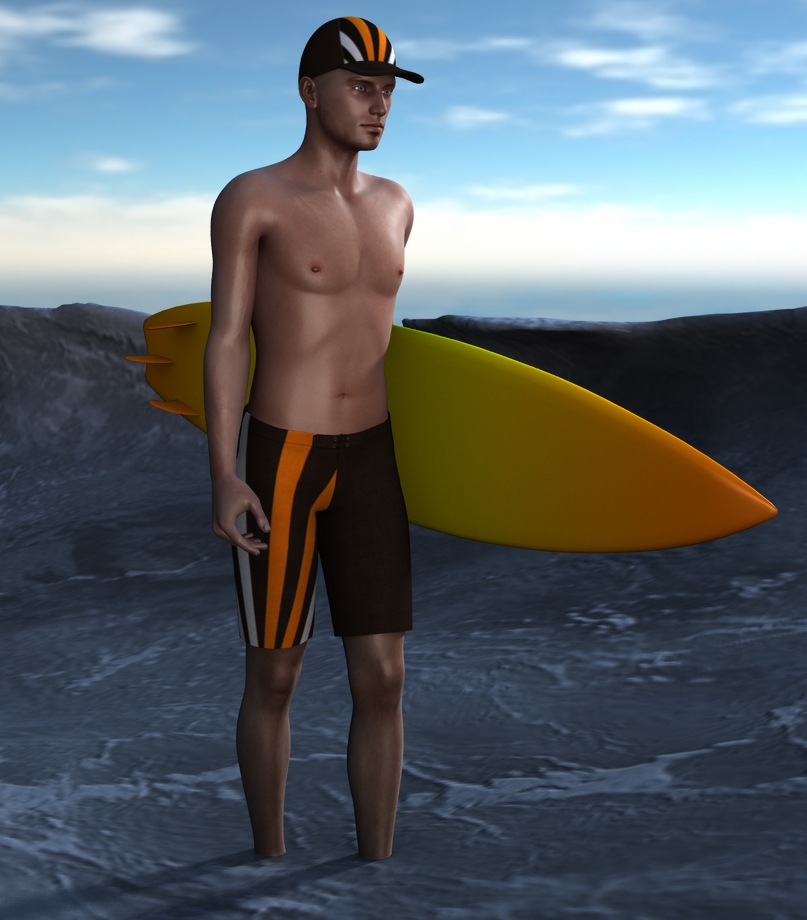 Ein paar Posen sind dabei und diese Surfkleidung incl. Board.