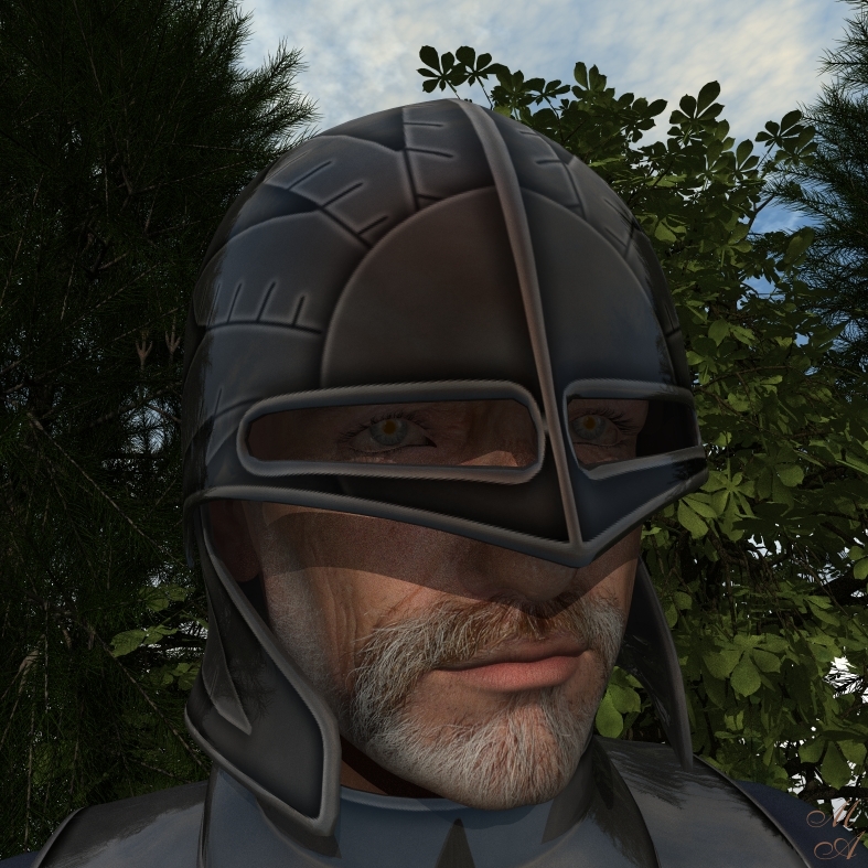 Mmmmmh, an sich ein schönes Motiv, aaaaber.... der Bart müsste in dem hautnahen Fall auf jeden Fall echt sein bzw. Partikelhaar (das kann Bryce nicht) und der Helm benötigt dringend Displacement. Bei Displacement verabschiedet sich Bryce ganz gerne, auch wieder ein Problem. Die Hauttextur ist gut.