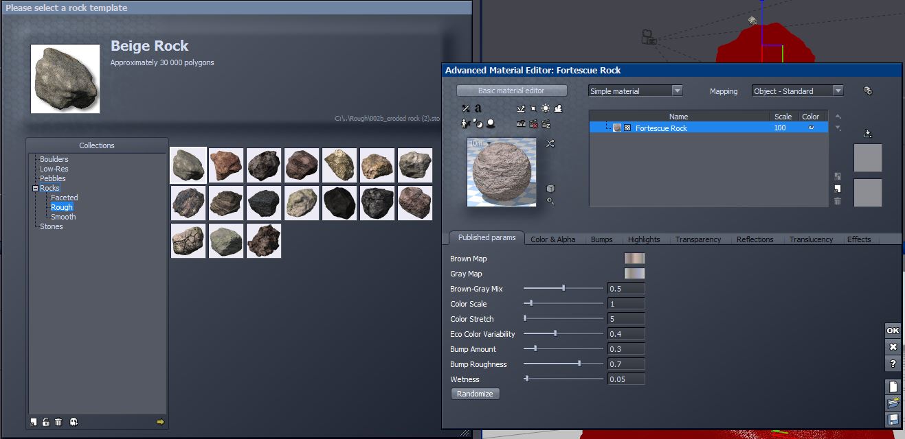 hab noch nen super tipp für dich, der mir grad wieder eingefallen ist: du kannst sehr gute gesteins-materialien direkt von vue "klauen". klingt komisch, ist aber so :) ...die materialien im standard-content kennt jeder. die sind meist noch aus den früheren vue-generationen und nicht sooo toll bzw. oft gesehen und ausgelutscht. aber in irgendeiner späteren vue-version (weiss grad nicht welche) sind ja als importierbare objekte die komplexeren steine hinzugekommen (siehe bild im anhang). die haben z.t. sehr gute und aufwendige procedural-texturen (welche NICHT im material-content mit gelistet sind). oft sind die texturen mit metadodes versehen, welcher dir gleich vorn im materialeditor umfangreiche editiermöglichkeiten bieten. also einfach nen stein mit toller textur laden und diese dann separat speichern :)