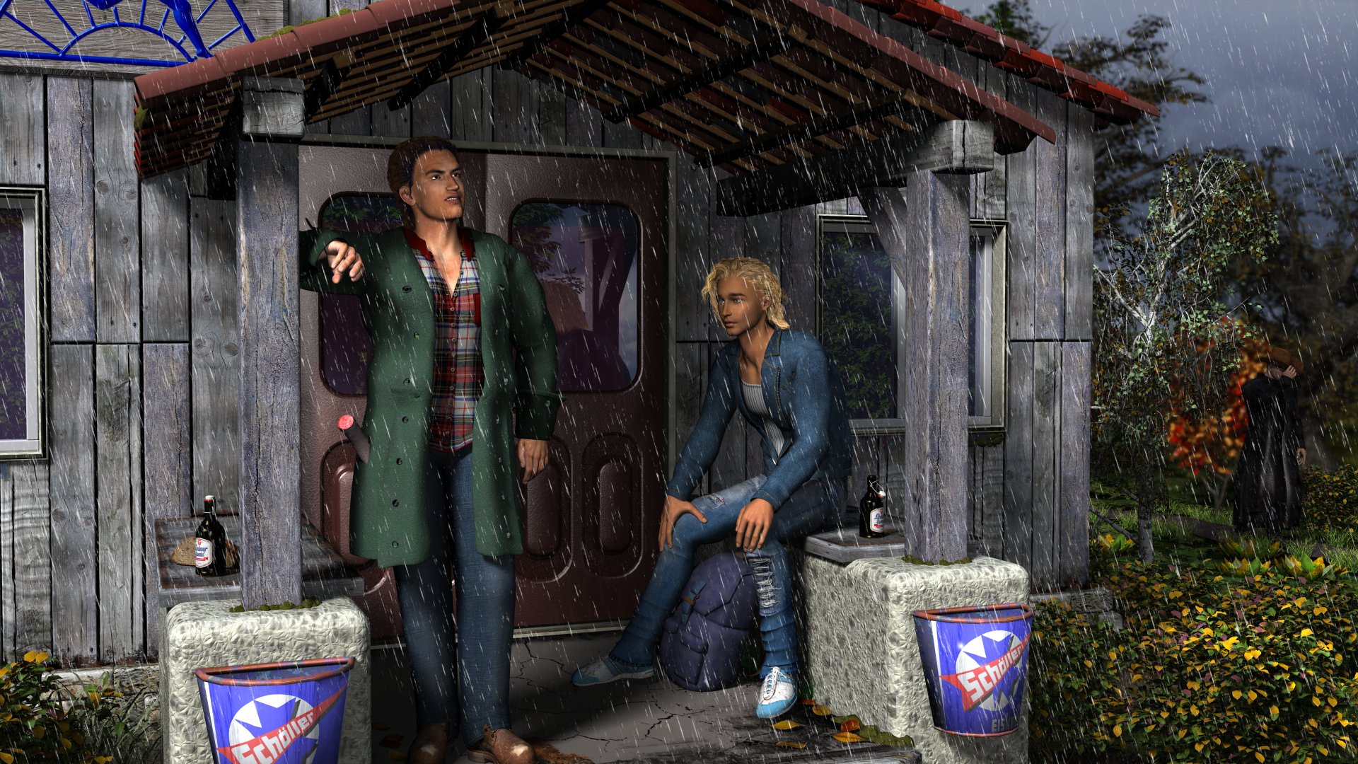 Die Geländehütte ist inzwischen bekannt. Natürlich habe ich das Gebäude aus einzelnen Brettern und Ziegeln zusammen gesetzt. Geht schneller als der allgemeine Nur-Texturen-Verwender glaubt. Kleine Flächen werden einfach geklont. Meine herbstlich gesammelten und eingescannten Baum&Busch-Blätter kommen zum Einsatz, darüber habe ich diese Woche in meinem täglichen Tagebuch berichtet: http://www.ICHANMICH.blogspot.com