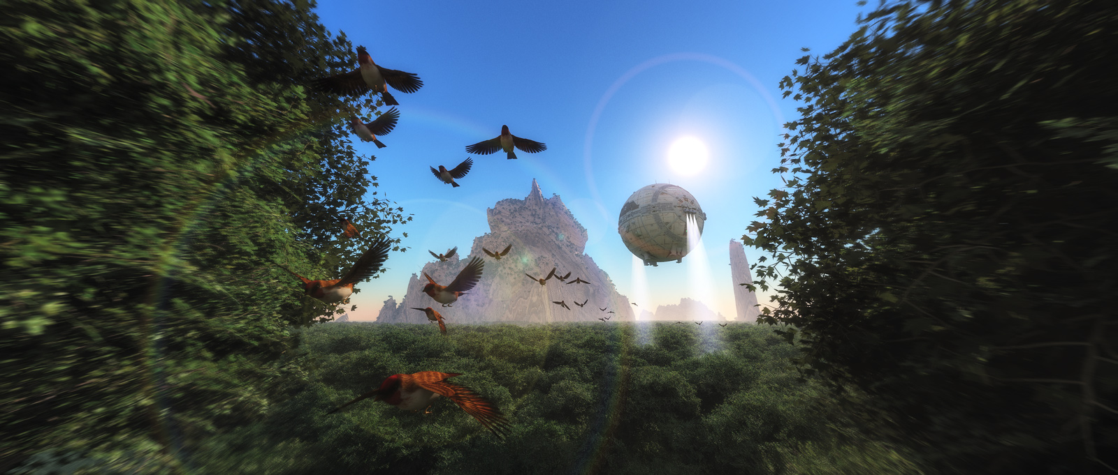 THX für die Kommentare, die sich ja z. T. sehr differenziert mit den Details und Hintergründen auseinandersetzen. In der Tat ist es ein Kugelraumer aus dem PR-Universum (danke citronenhai für den link!) , die Vögel isnd allerdings keine Kolibris ( @ T-Techniker) , sondern freifliegende Schwarmvögel, die sich auch gerne auf Lichtungen aufhalten. Im Bild sind sie gerade aufgeschreckt und haben sich einfach ins Bild geschoben.