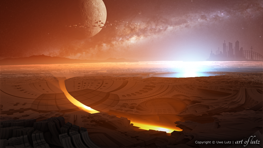 Die Originalmaße des Bildes sind 3552 x 2000 Pixel. Der Vordergrund ist in Mandelbulber entstanden, hat ca. 4 Std. zum Rendern gebraucht. Der Mond in Vue und schließlich alles mit Gimp zusammen gebacken.