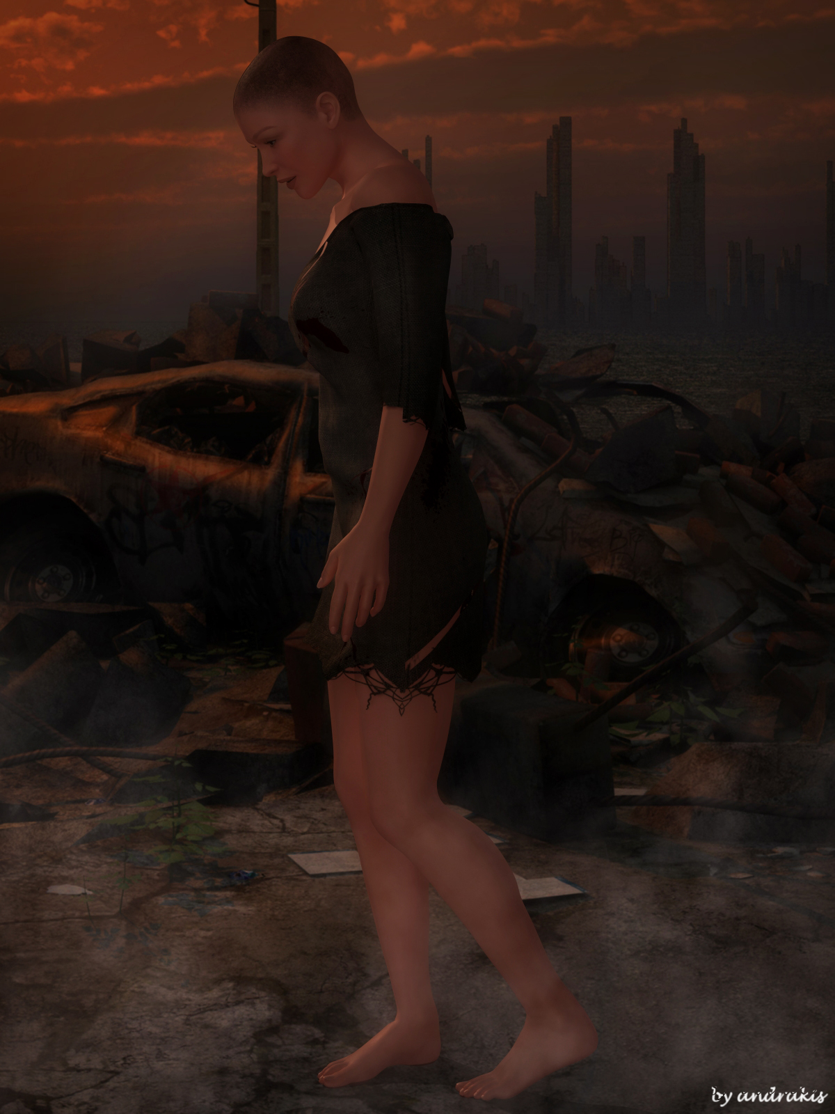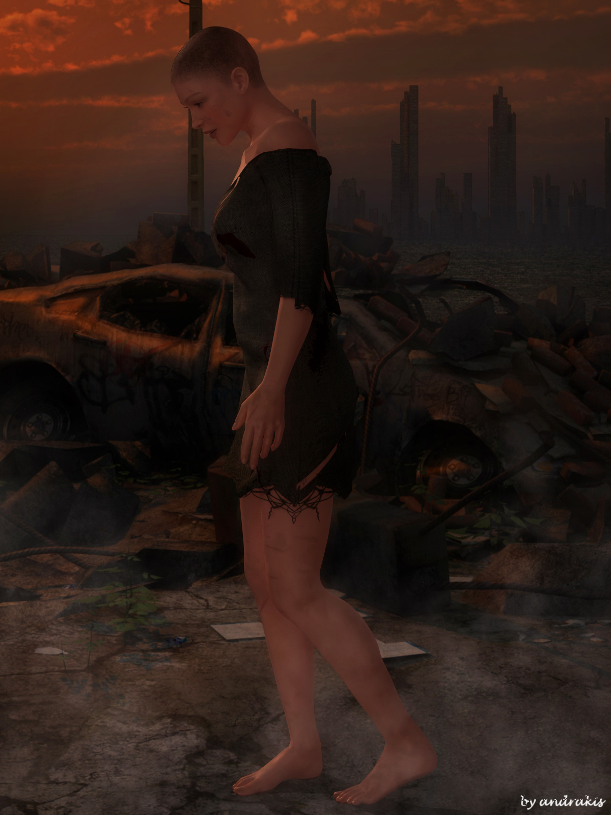 Auch nach meinem Empfinden ist das Mädchen noch viel zu sauber. Wenn ihre Kleidung schon so in Fetzen hängt, dann würden Brandwunden, Splitter, Schürfwunden und Ruß dazu gehören. Wenn du dir mal Aufnahmen der Überlebenden von Hiroshima anschaust, dann findest du kaum jemanden, der nicht von Splittern getroffen wurde. Gerade in modernen Großstädten mit ihren riesigen Glasfassaden wären das Milliarden von Geschossen, die einem bei der Explosion da um die Ohren flögen.