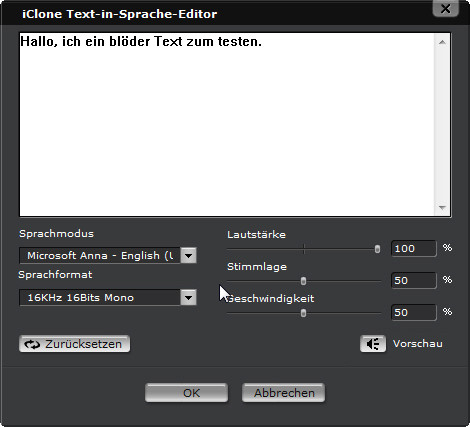 Habe es eben grade getestet, weil ich noch nie Text-to-Speech in iClone ausprobiert hatte. Geht ohne Probleme, wenn man davon absieht, dass sich seltsamer Weise nur die englische Stimme "Anna" auswählen lässt, obwohl ich jede Menge Stimmen im System installiert habe.