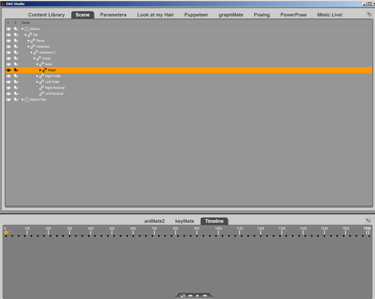 Von aniMate war nicht die Rede :) Mit Timeline habe ich die Standart-Timeline gemeint. Im obrigen Anhangbild ist auch der Tab mit der "normalen" Timeline zu sehen. Schau bitte mal nach, wenn Du den Kopf im Scene-Tab markiert hast, ob Du dann in der Timeline die Keyframes sehen kannst.