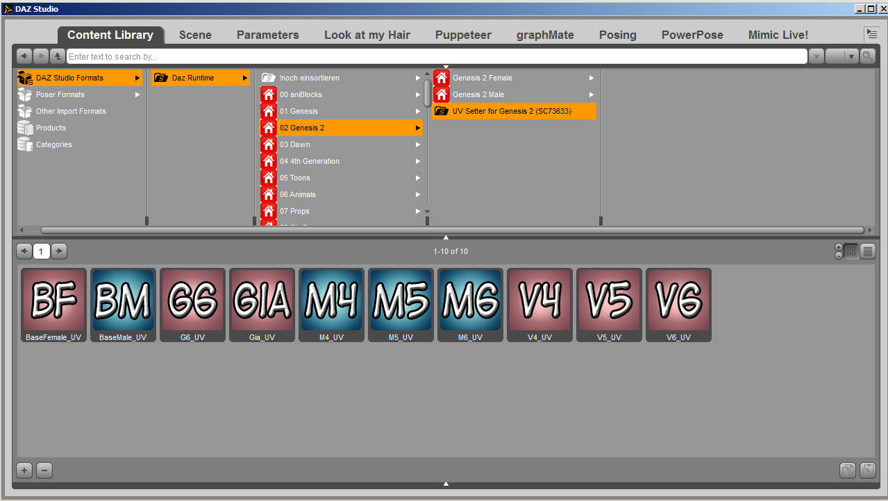 2. In die Poserebene gehen und dort die pz2-Materialzuweisung auf die Genesis-Figur anwenden. (Entweder Doppelklick oder per Drag & Drop)