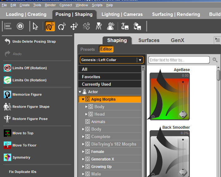 Wenn Du die Genesis-Figur geladen hast, dann müssten die Schieberegler im Shaping-Tab unter "Actor" und Untergruppe "Aging Morphs" zu finden sein. (Siehe drittes Anhangbild)Ansonsten bitte ich nochmal um Präzisierung der Probleme.