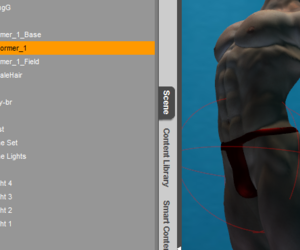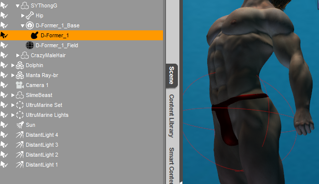 Den D-former darfst du bei Teilen mit Weight [lexicon]Mapping[/lexicon] (egal ob Figur oder Kleidung) nicht an ein Körperteil hängen, sondern immer nur an den Haupt-Node, also in diesem Fall an SYThongG.Aber es gibt einen eleganteren Weg: Du kannst einen Smoothing Modifier anwenden (oder ihn einschalten, falls er schon da sein sollte) und als Kollisionsobjekt die Figur auswählen. Dann verschwinden die Löcher von selbst.