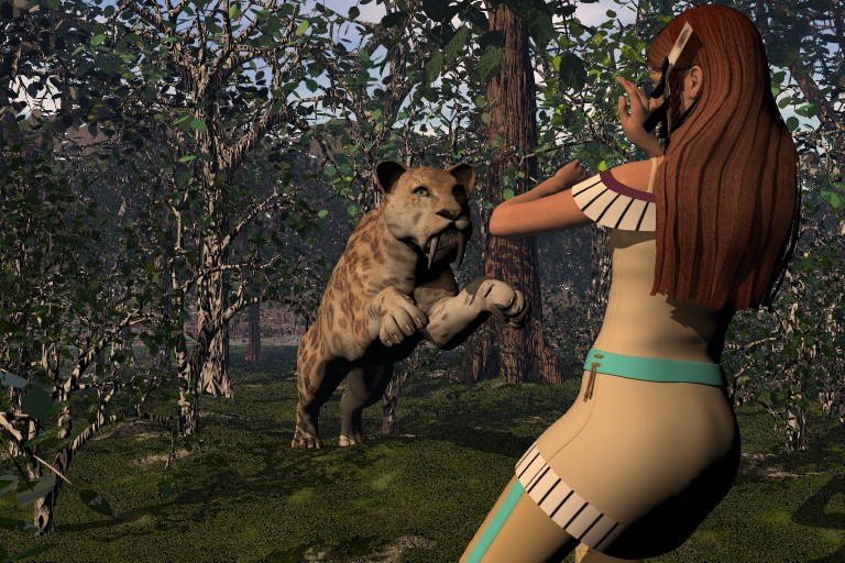 Für mein Bild habe ich mich entschieden, die Akteure ein wenig zu verändern. Statt für Dinofelis und Homo habilis in Afrika entschied ich mich für eine menschliche Begegnung mit Smilodon, der letzten Säbelzahnkatze. Solche Begegnungen wird es immer wieder gegeben haben, immerhin lebten Menschen und Smilodons für mehrere Tausend Jahre nebeneinander in Nordamerika und Teilen Südamerikas, bis die Smilodonkatzen vor ca. 10.000 Jahren verschwanden.