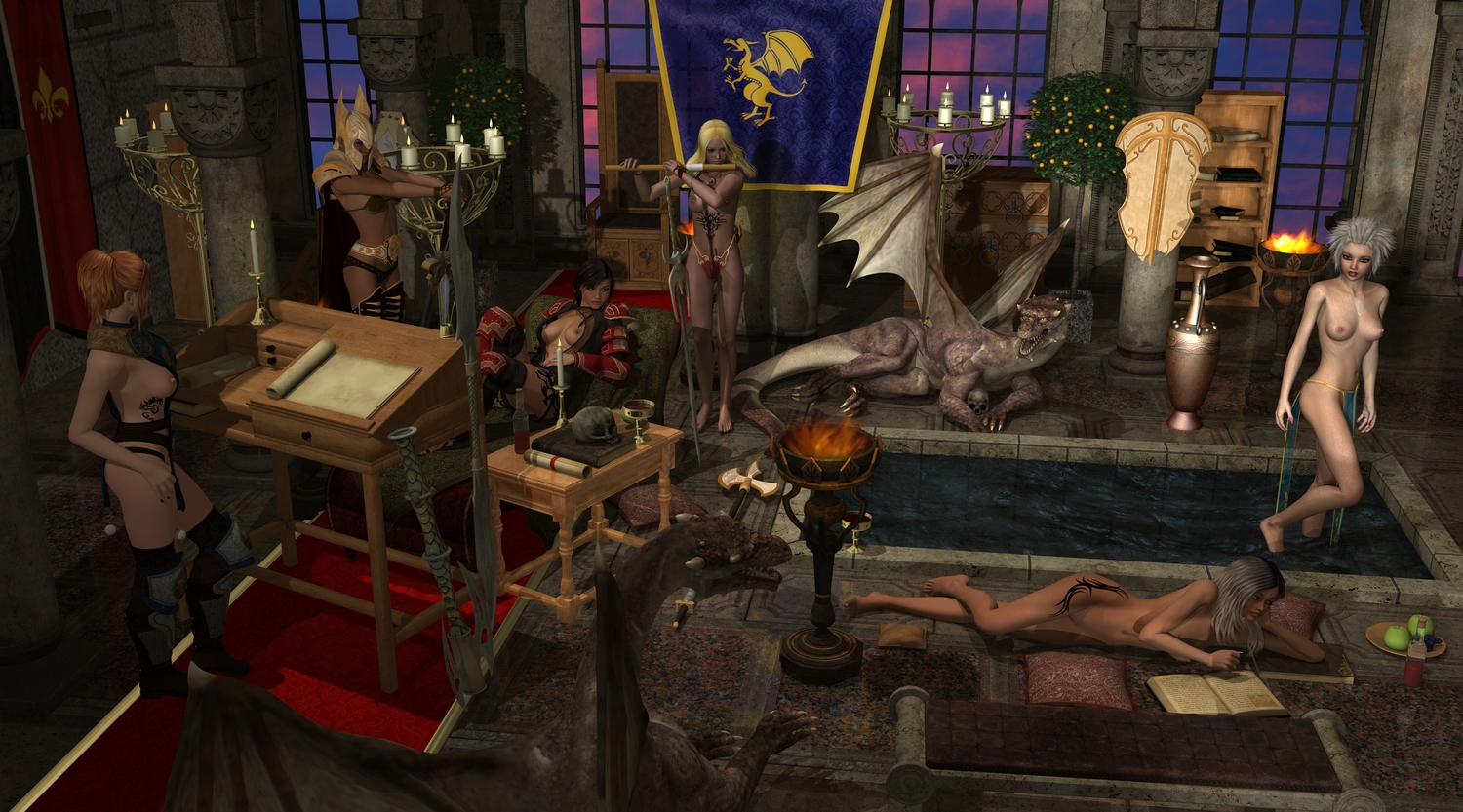 Nachdem ich für eine Bekannte eine paar Bilder machen sollte,habe ich festgestellt,daß ich doch schon mit meinen Fähigkeiten weiter bin,als ich gedacht habe.Also habe ich mich an einem größeren Bild gewagt.Titel "Auf der Drachenpfalz".Gleichzeitig war es ein Test,um die Leistungsfähigkeit der Hardware zu testen.Ich habe zwei Gebäude zusammen gesetzt,die Grundplatte ausgeblendet und eine neue Platte mit Bad eingefügt.Die störende Fensterreihe habe ich mit einem weiteren Gebäude verschlossen.Die eingefügten Teile habe ich nicht gezählt.Dann zwei Drachen und sechsmal V 4.2.Alle Figuren sind bearbeitet,Muscle Morphs,Tattoos,Fingernägel,dazu veränderte Kleidung.Spiegelnder Fußboden und doppeltes Licht.Ehrlich gesagt,ich hätte nie gedacht,daß das noch rendert.Ein Manko was ich noch habe,mir fehlen immer noch Wet Hairs.