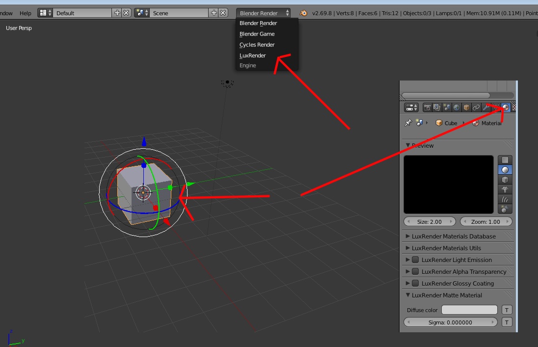 Wenn Du alles nach ANleitung installiert hast, dann musst Du auch noch auf den LuxRender umschalten. Siehe Dateianhang, dann Objekt auswählen und auf Material gehen, siehe ebenfalls Anhang.