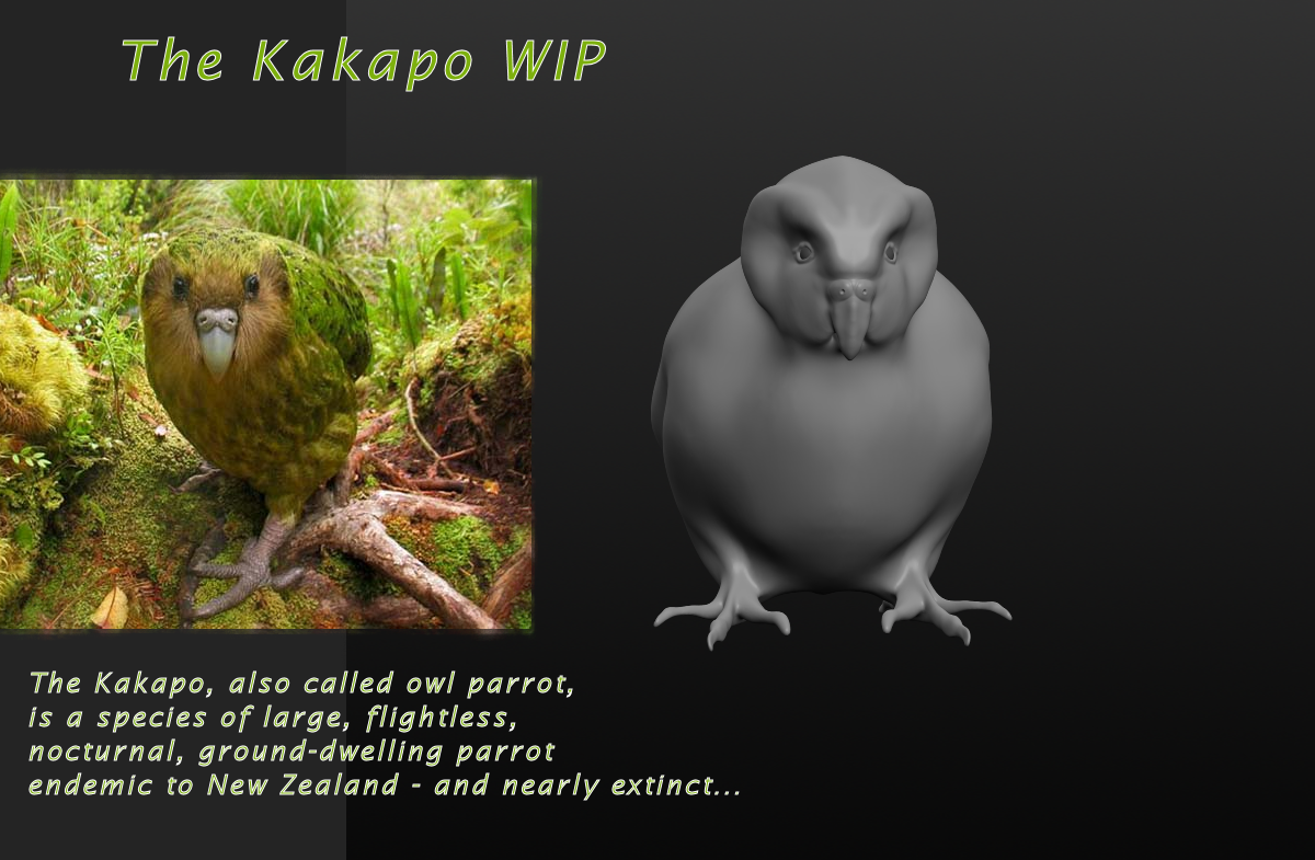 Dieses besondere Geschöpf habe ich heute per Zufall beim Browsen gefunden und nun wird es in Sculptris neu geboren und in einer Vue Landschaft verewigt werden...Nur noch 150 dieser flugunfähigen, nachtaktiven Eulenpapageien, die bis zu 120 Jahre alt werden können, gibt es - aber sie werden inzwischen gut bewacht und geschützt