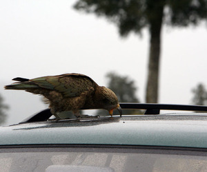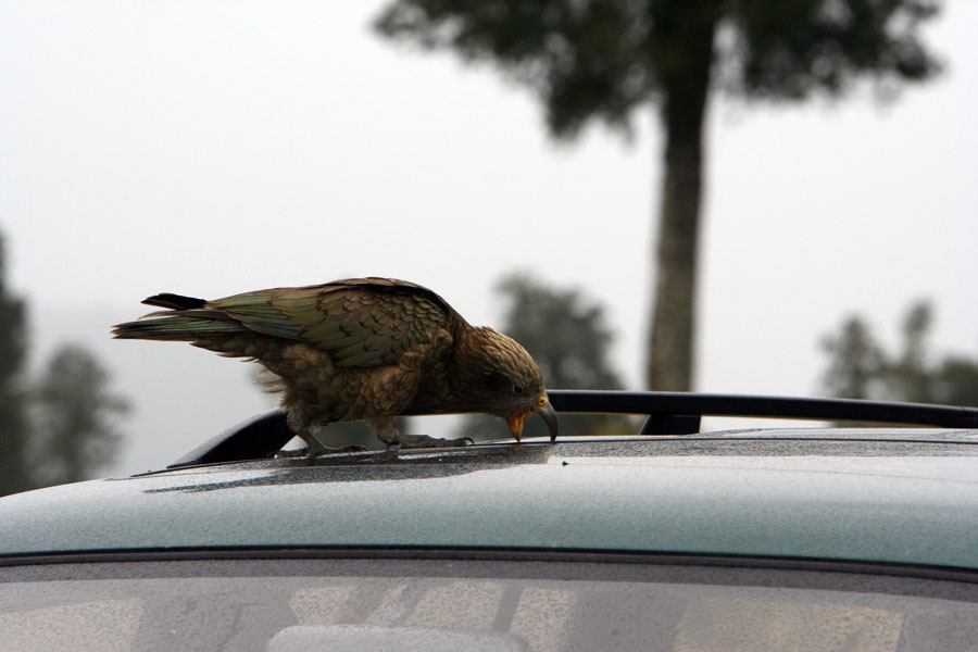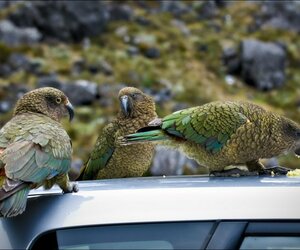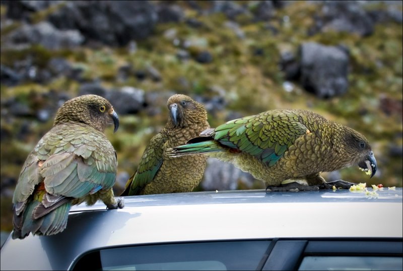 Keas können zwar noch fliegen, sind aber in ihrem Charakter viel expeditionsfreudiger und aggressiver. Es sind alpine Tiere, die über das Jahr verteilt mit einem völlig unberechenbaren Nahrungsangebot klarkommen müssen. 70% der Jungtiere sterben im ersten Jahr. Daher rührt wahrscheinlich die extreme Neugier und Intelligenz der Tiere. Der Rückgang der Keas basiert vorwiegend auf den Abschüssen der Vögel durch britische Bauern, die Sorge um ihre Schafe hatten.