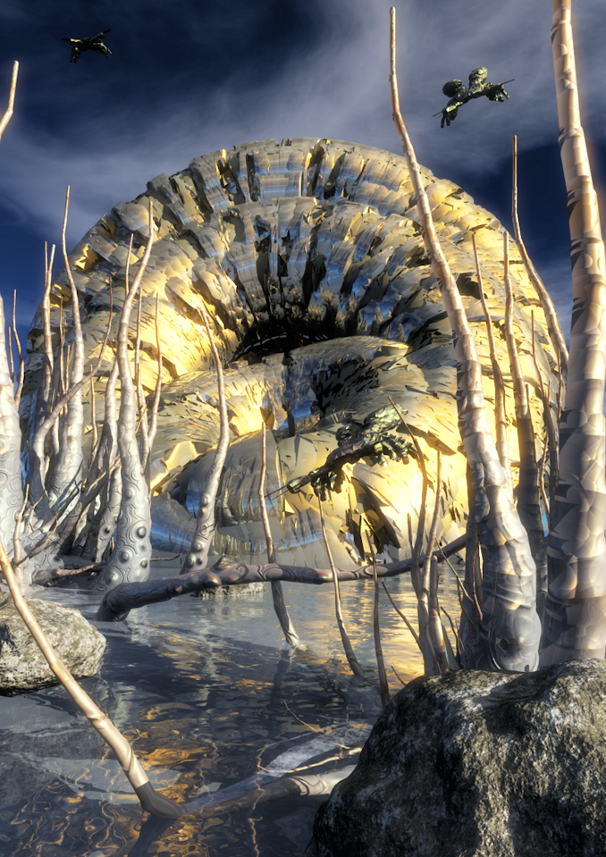 Vereint in diesem Werk sind ein mit Incendia erstelltes Fractal, was in Vue mit Displacement texturiert wurde, die alien mussafa Pflanze von C3d (ich liebe dieses Ding, das ist so ausgesprochen vielfältig umzugestalten ) editiert und mit eigenen Texturen versehen, und ein ebenfalls in Vue retexturiertes 3d objekt (combine dropship, domawe) - oh, und die Wolken sind von Dirk Scherzinger(aus einem bundle von C3d) und die Atmosphere is eine selbstgebastelte photometrische.