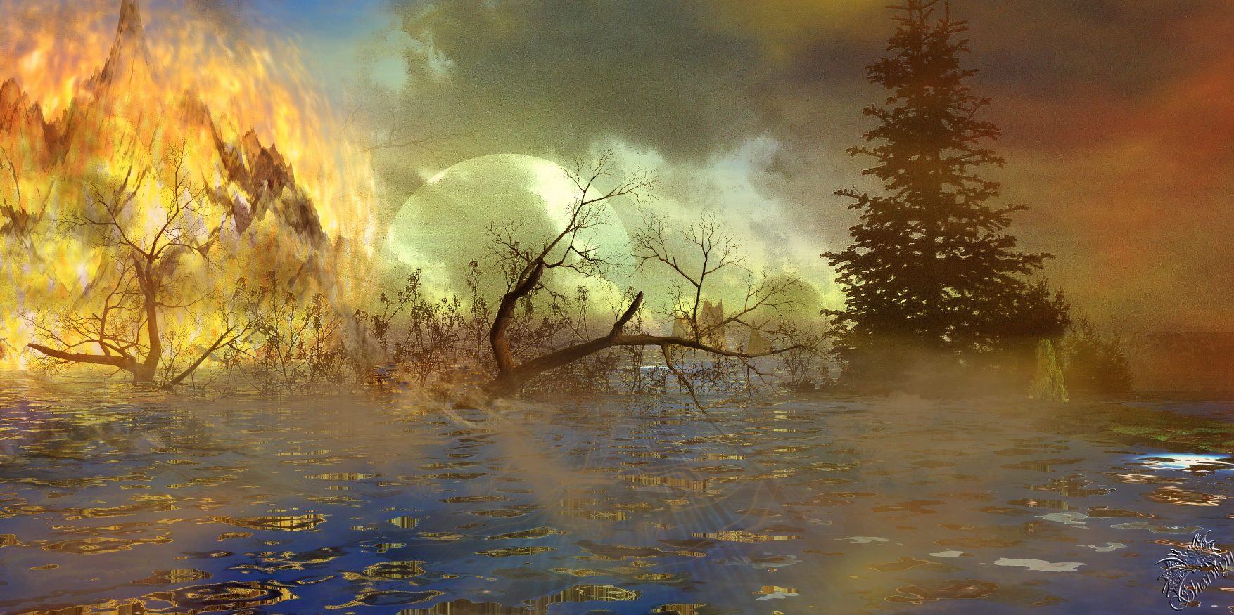 uiuiui ja, das sieht wirklich apokalyptisch aus, wiewohl in freundlichen bunten Farben, so sind es Wasser und Feuer die alles verschlingen....
