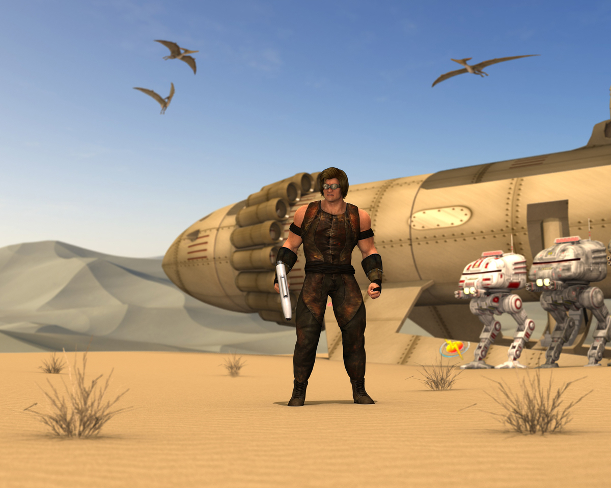 • Gianni in Outpost Mercenary in EasyEnvironments - Desert, einige Robots und das 1937-Flash-Gordon-Raumschiff, das erfreulicher Weise in DAZ keinerlei Probleme machte.